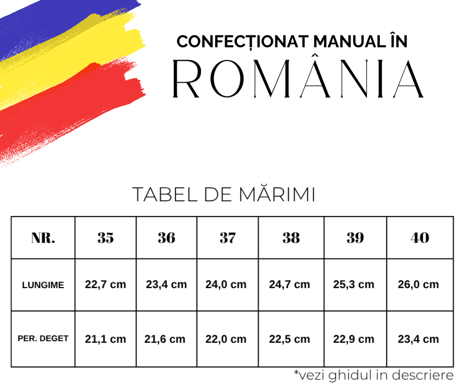 Sandali este un atelier românesc specializat în încălțăminte personalizată, executată la comandă în funcție de dimensiunile exacte ale piciorului. În tabelul de mai jos sunt prezentate mărimile calapoadelor disponibile în atelier, însă putem ajusta dimensiunile în funcție de măsurătorile oferite de dumneavoastră prin telefon.