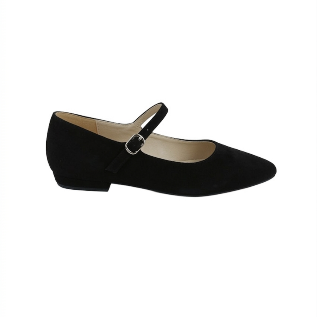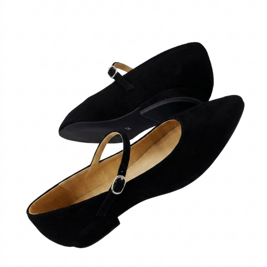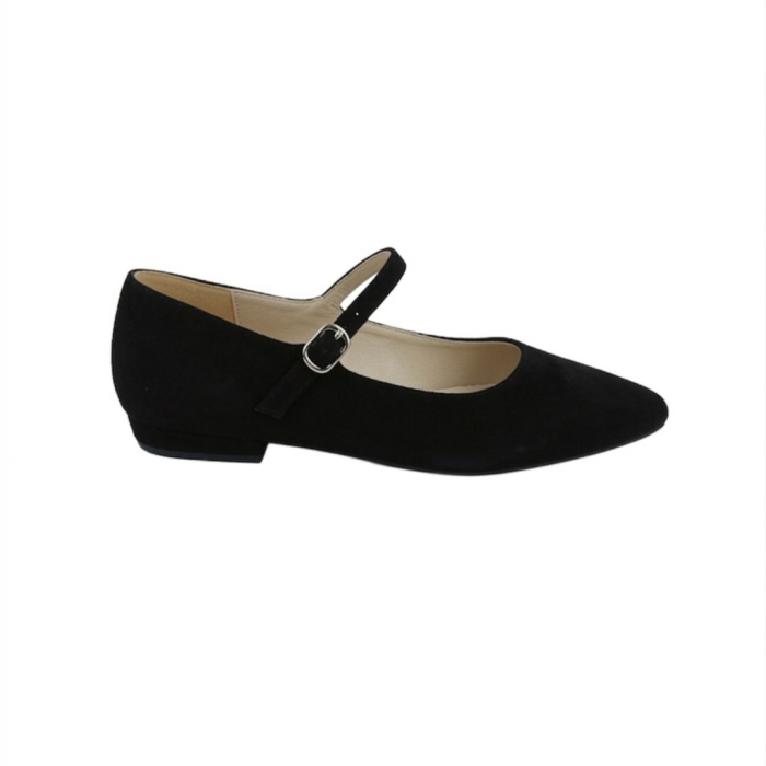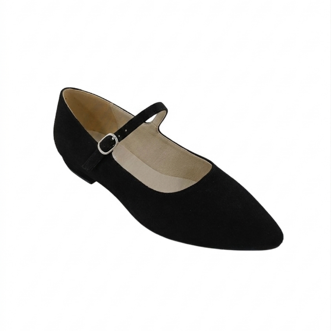 Acești balerini din piele întoarsă neagră sunt alegerea ideală pentru femeile care își doresc încălțăminte elegantă, comodă și versatilă. Bareta subțire cu cataramă argintie și vârful ascuțit creează un design modern, inspirat din stilul Mary Jane, perfect pentru ținute de zi cu zi sau momente în care vrei să arăți chic fără efort.