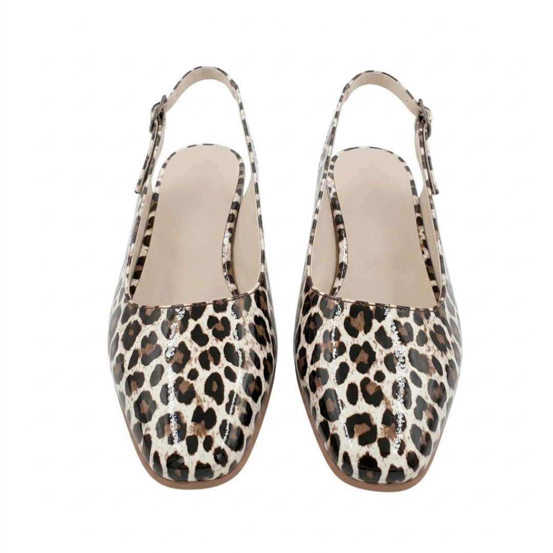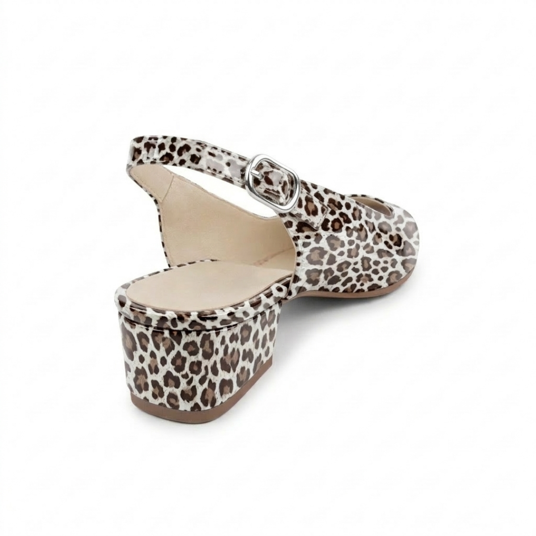 Acești pantofi damă slingback sunt realizați din piele naturală și impresionează prin imprimeul leopard lacuit, un design modern și îndrăzneț care adaugă personalitate oricărei ținute. Modelul are vârf pătrat și o bareta reglabilă la călcâi, ce oferă susținere sigură și un plus de eleganță.
