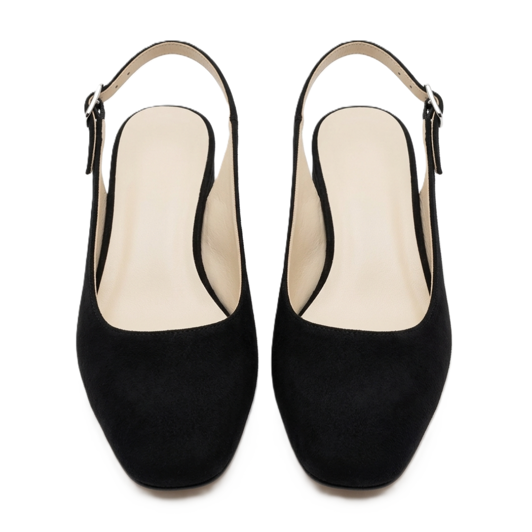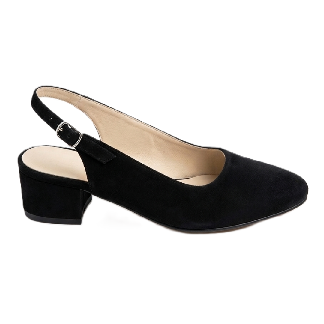 Acești pantofi damă slingback sunt realizați din piele întoarsă neagră și impresionează prin aspectul elegant și rafinat, perfect pentru ținute moderne și feminine. Modelul are vârf pătrat și o bareta reglabilă la călcâi, care oferă susținere sigură și un plus de stil.