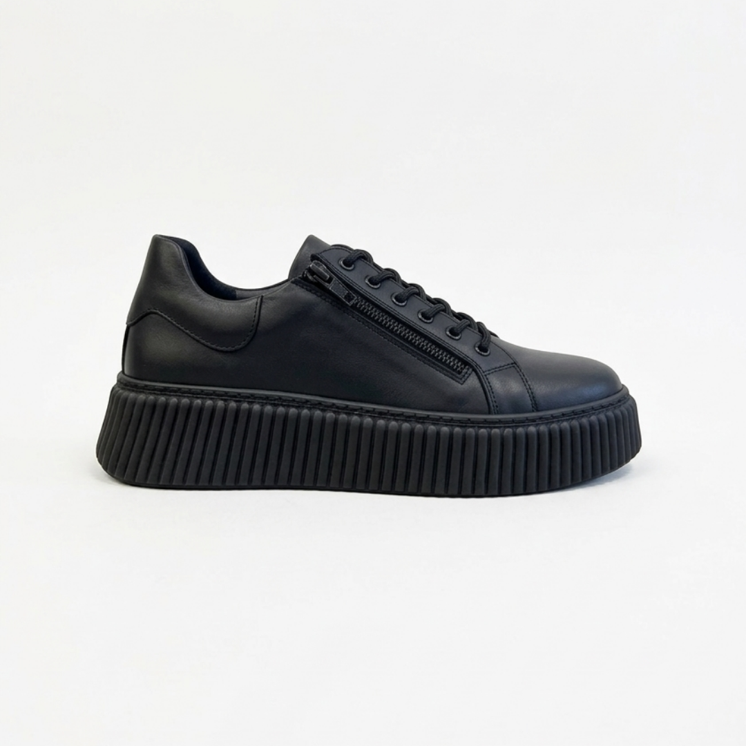 Acești sneakers pentru damă sunt realizați integral din piele naturală box neagră, combinând un design modern cu funcționalitate și confort pentru purtare zilnică. Aspectul minimalist, fără texturi, oferă un look curat și premium, ușor de integrat în orice garderobă. Cele două fermoare laterale permit o încălțare rapidă și comodă, iar șireturile asigură ajustare perfectă pentru orice tip de picior.