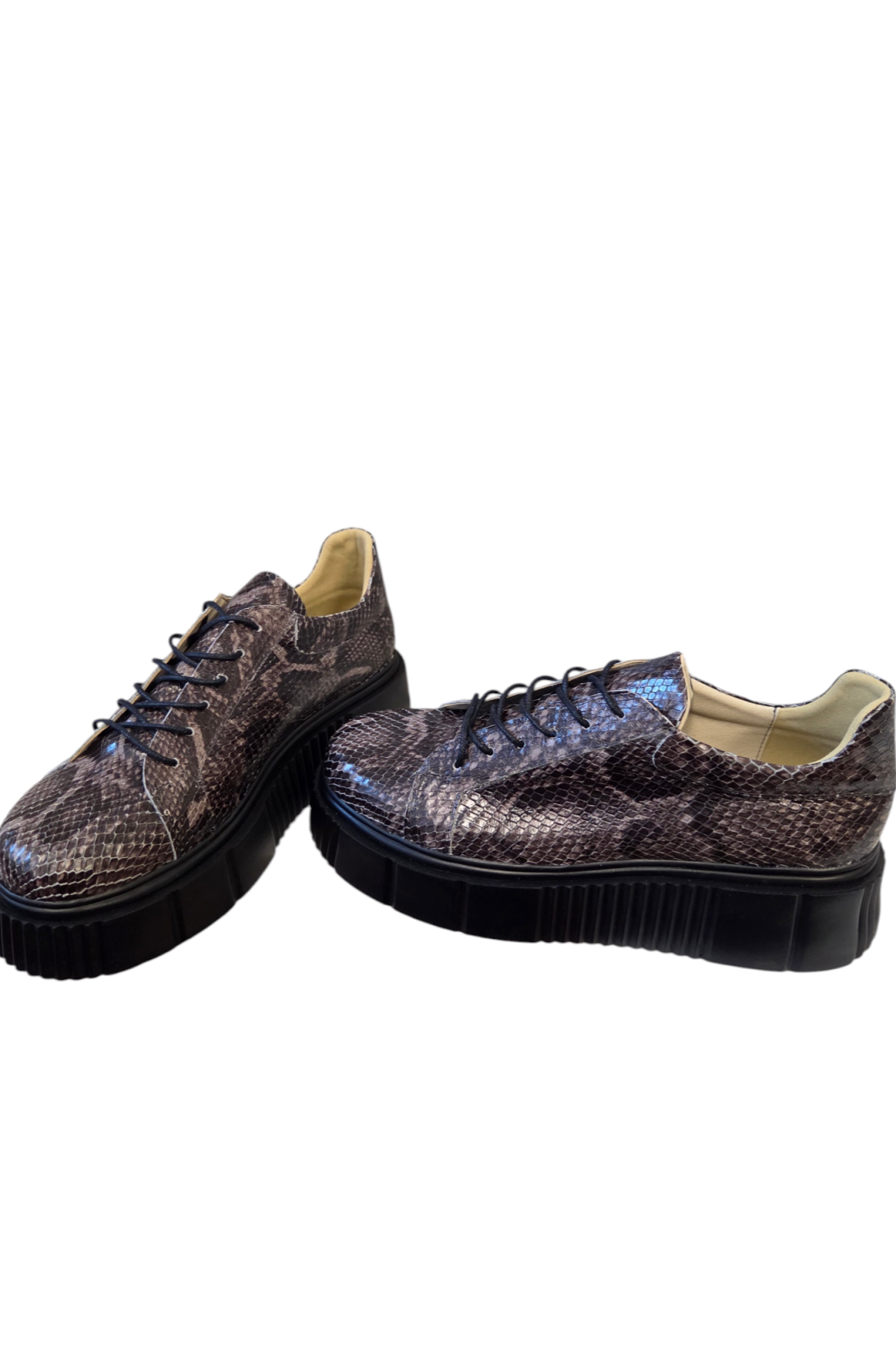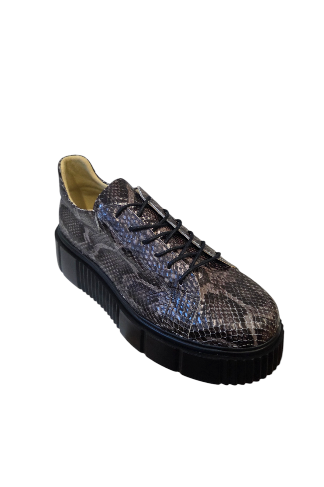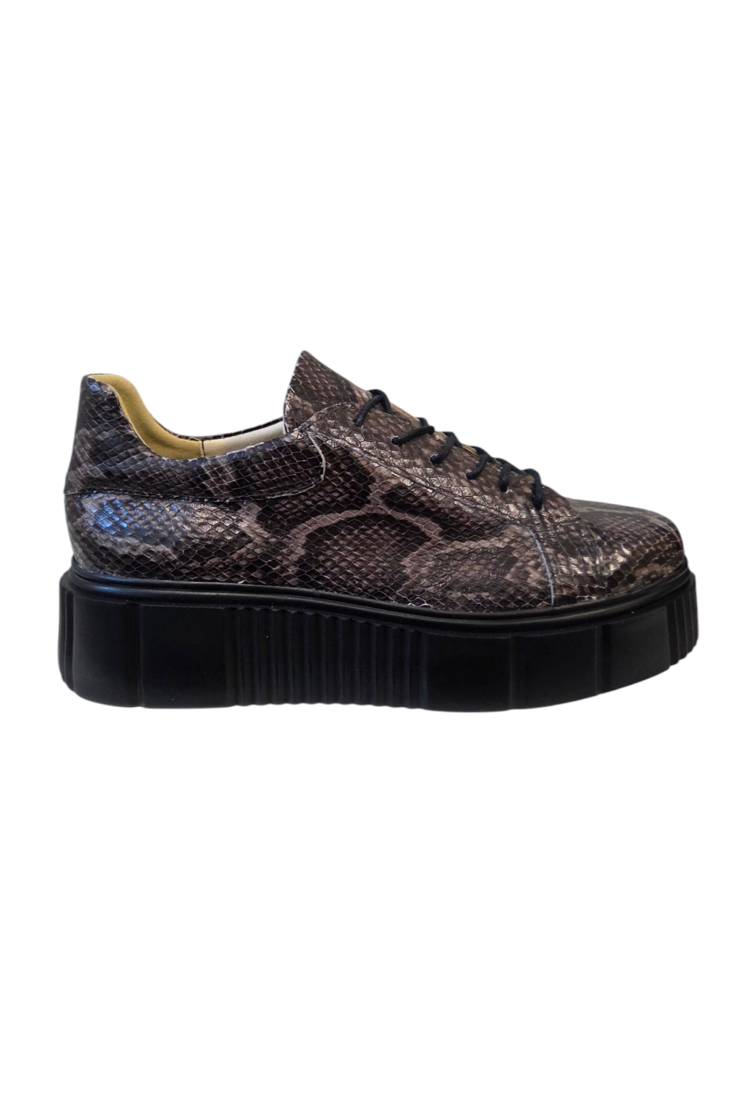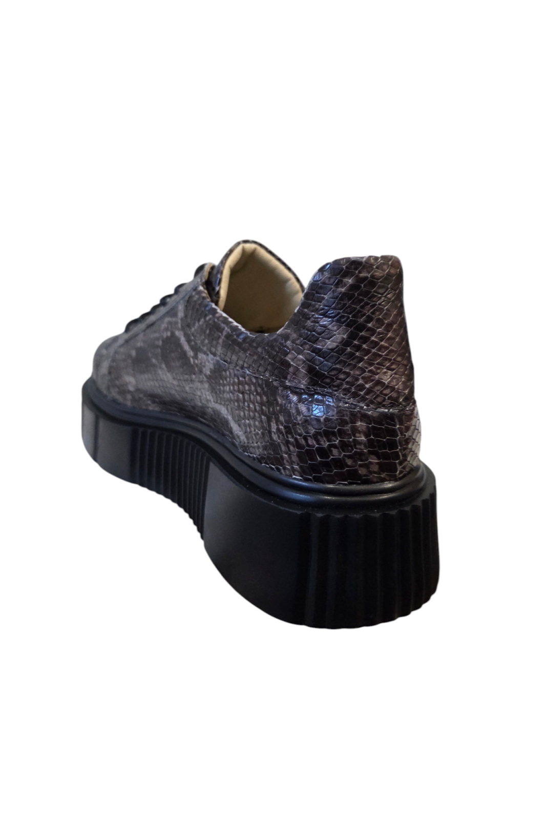 Pantofi damă casual cu un design modern și îndrăzneț, realizați din piele ecologică cu finisaj lucios și imprimeu tip piele de șarpe în nuanțe elegante de negru, gri și bej. Modelul este completat de o talpă groasă, texturată, din poliuretan, care oferă stabilitate și confort la fiecare pas. Închiderea cu șireturi negre asigură o potrivire perfectă, iar interiorul căptușit în nuanță bej adaugă un plus de rafinament.