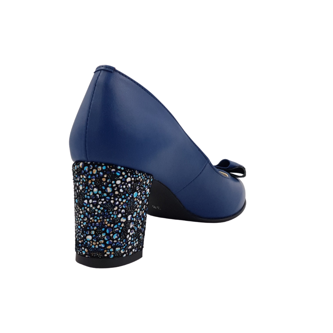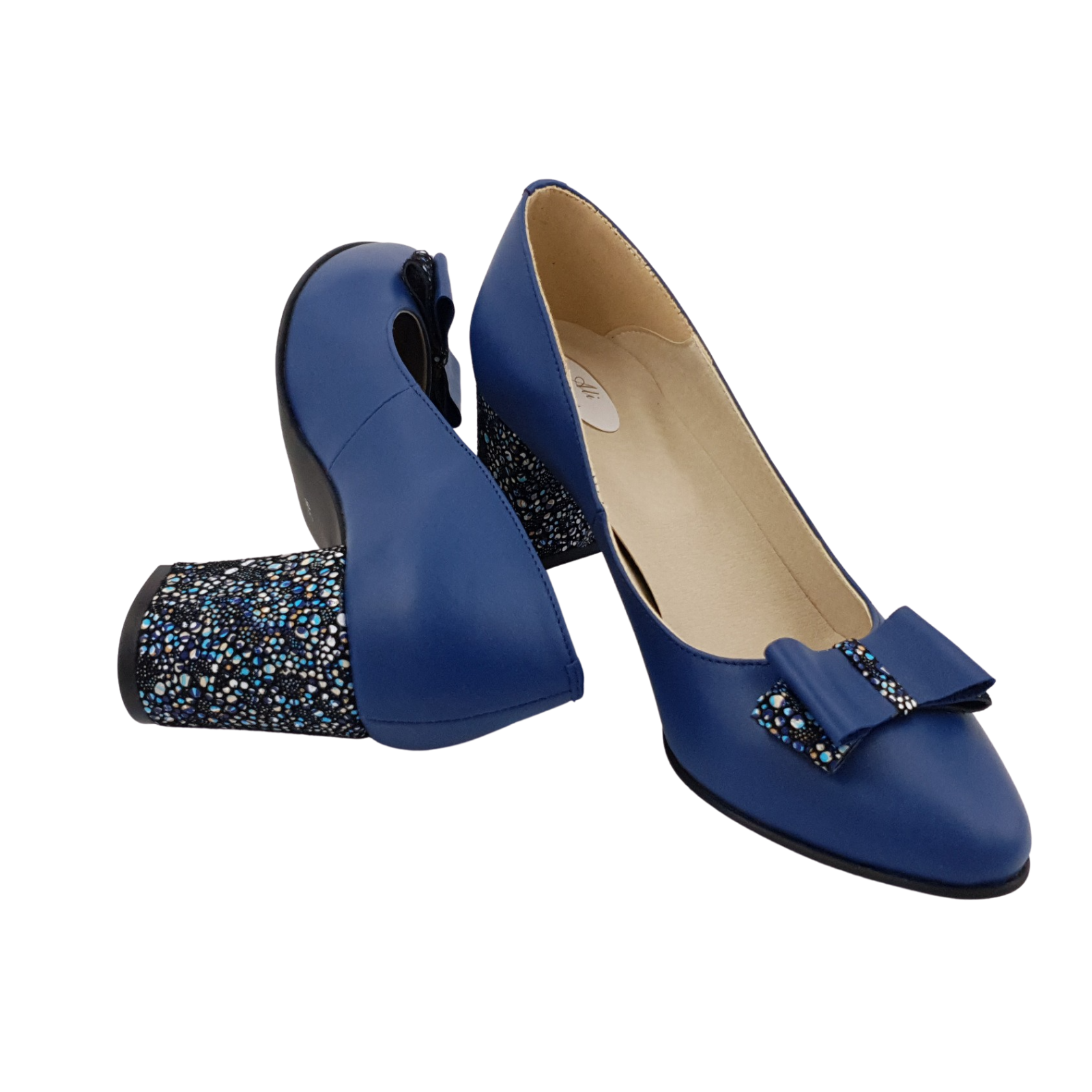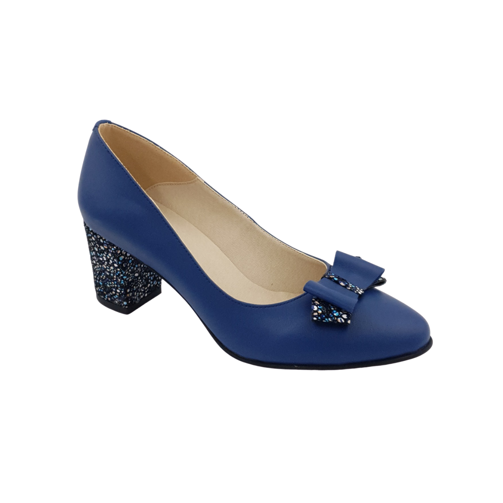 Tocul gros de 6 cm, îmbrăcat în imprimeu floral albastru, adaugă un detaliu vizual rafinat. Funda decorativă, realizată din piele naturală box și imprimeu floral asortat, completează perfect designul și conferă pantofilor o notă distinctă.