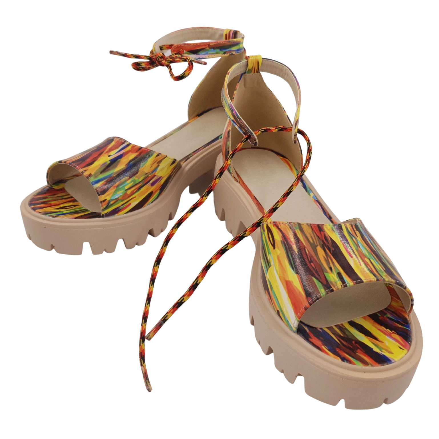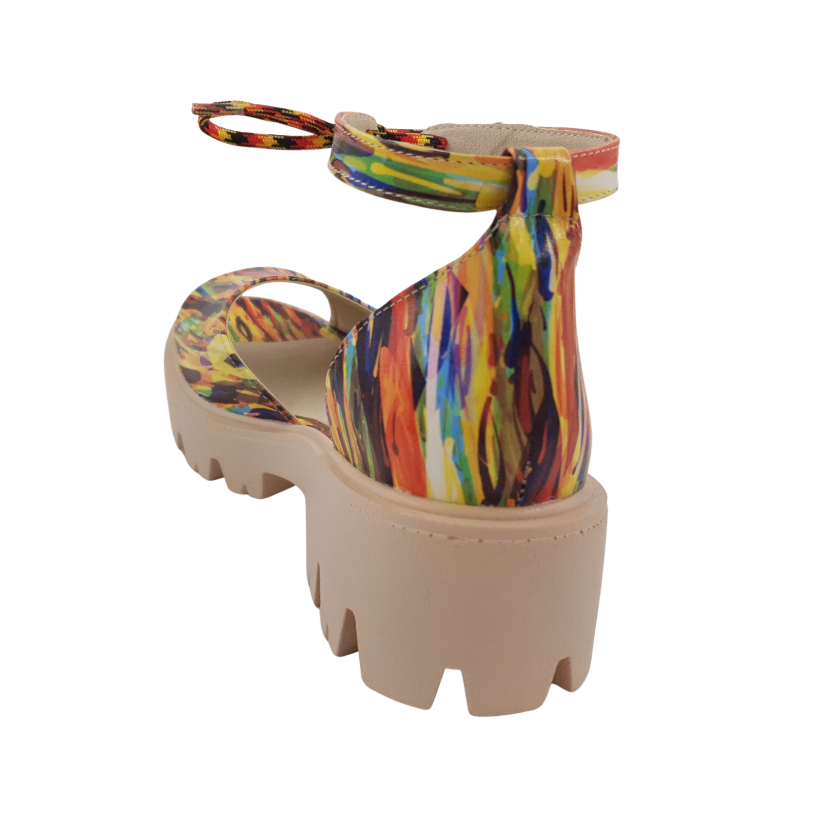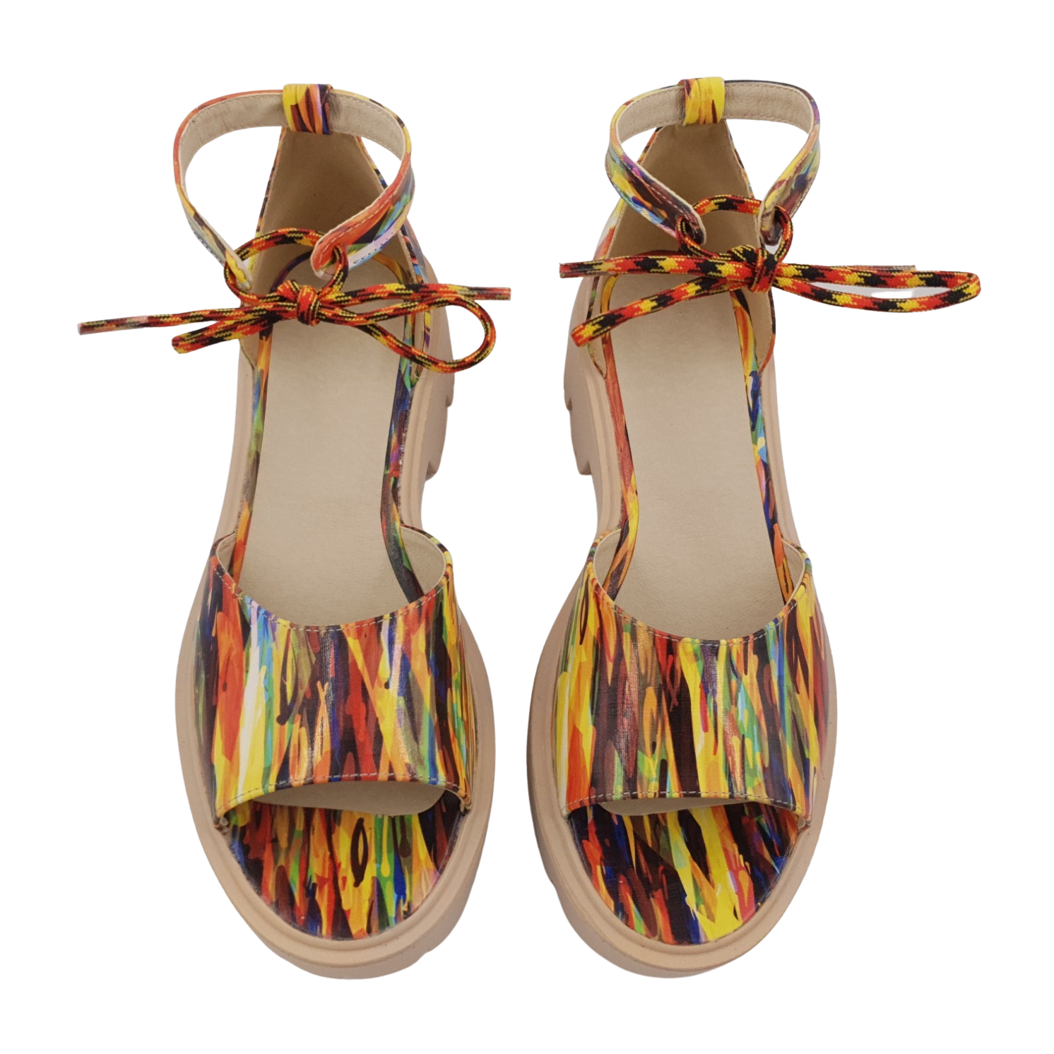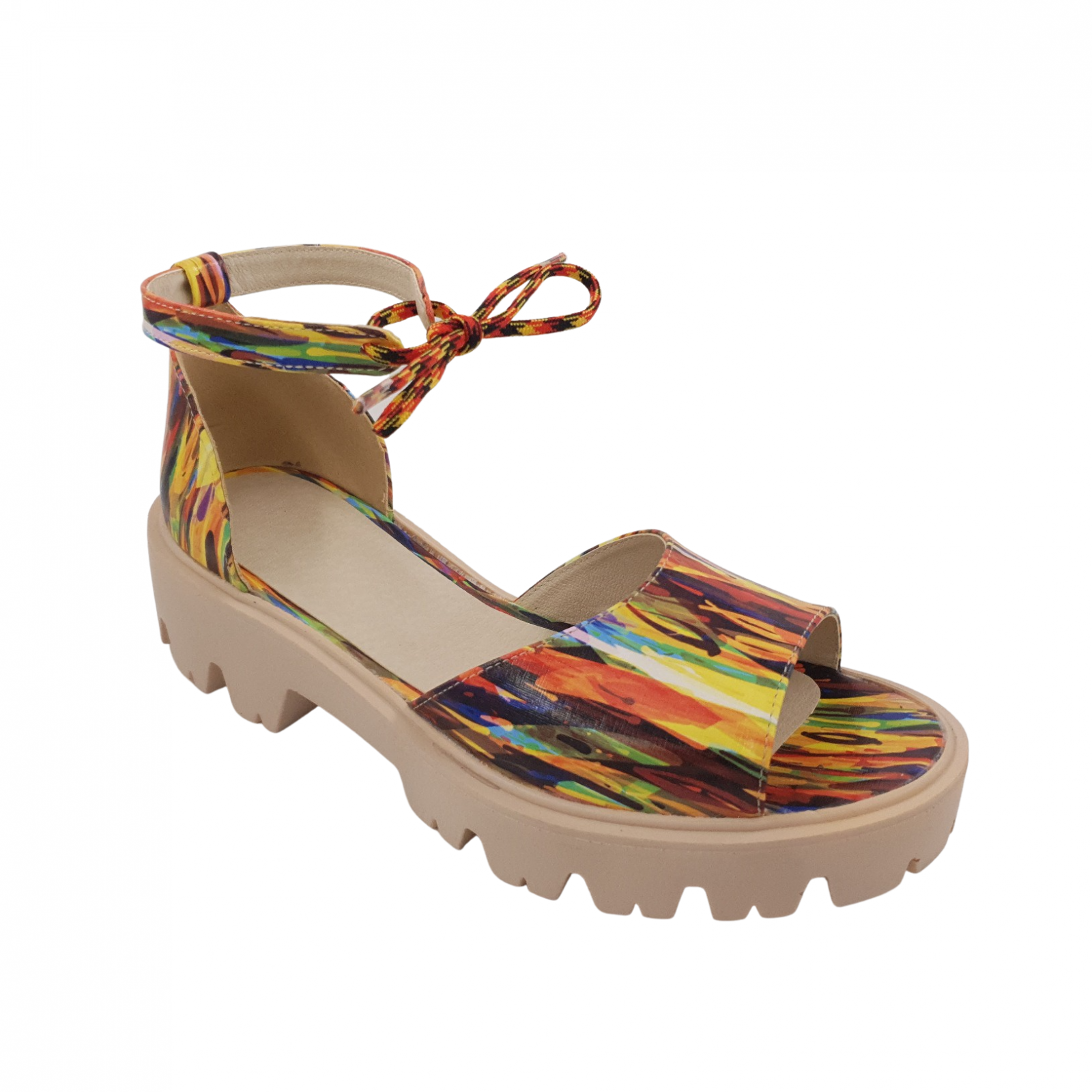 Sandale dama din piele naturala cu imprimeu de picturi colorate, piele ecologica in interior, varf rotund decupat, talpa usoara din poliuretan cu crampoane de culoarea bej, antiderapanta, se inchide cu sireturi colorate,de purtat pentru sezonul de primavara si vara.