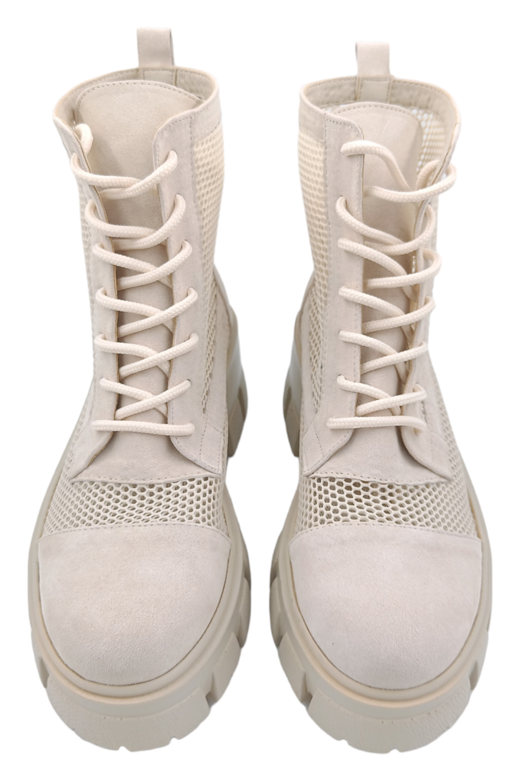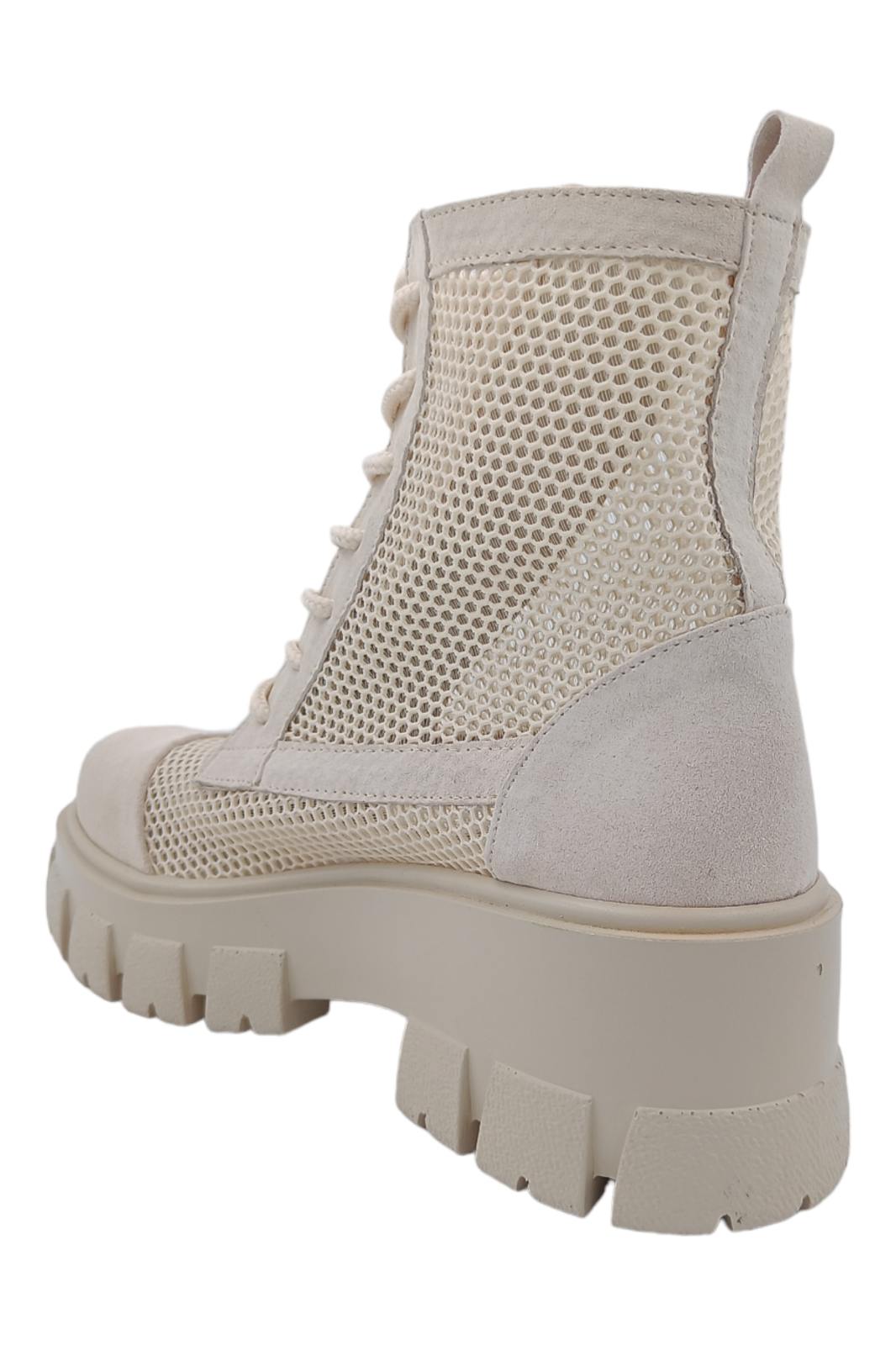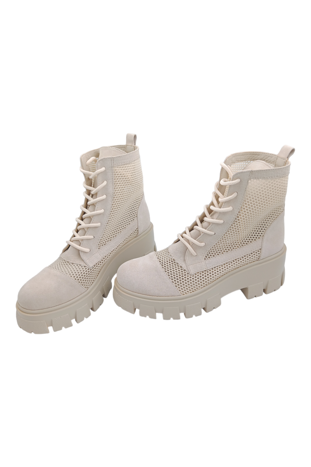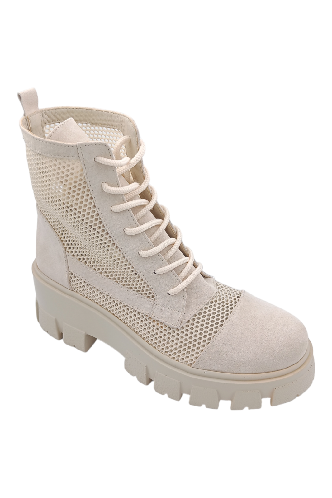 Ghete damă realizate din piele naturală întoarsă, într-o nuanță luminoasă de bej deschis, concepute pentru un look aerisit și natural. Inserțiile de plasă adaugă respirabilitate și un aspect modern, transformând acest model într-o alegere ideală pentru sezonul de primăvară‑vară‑toamnă.