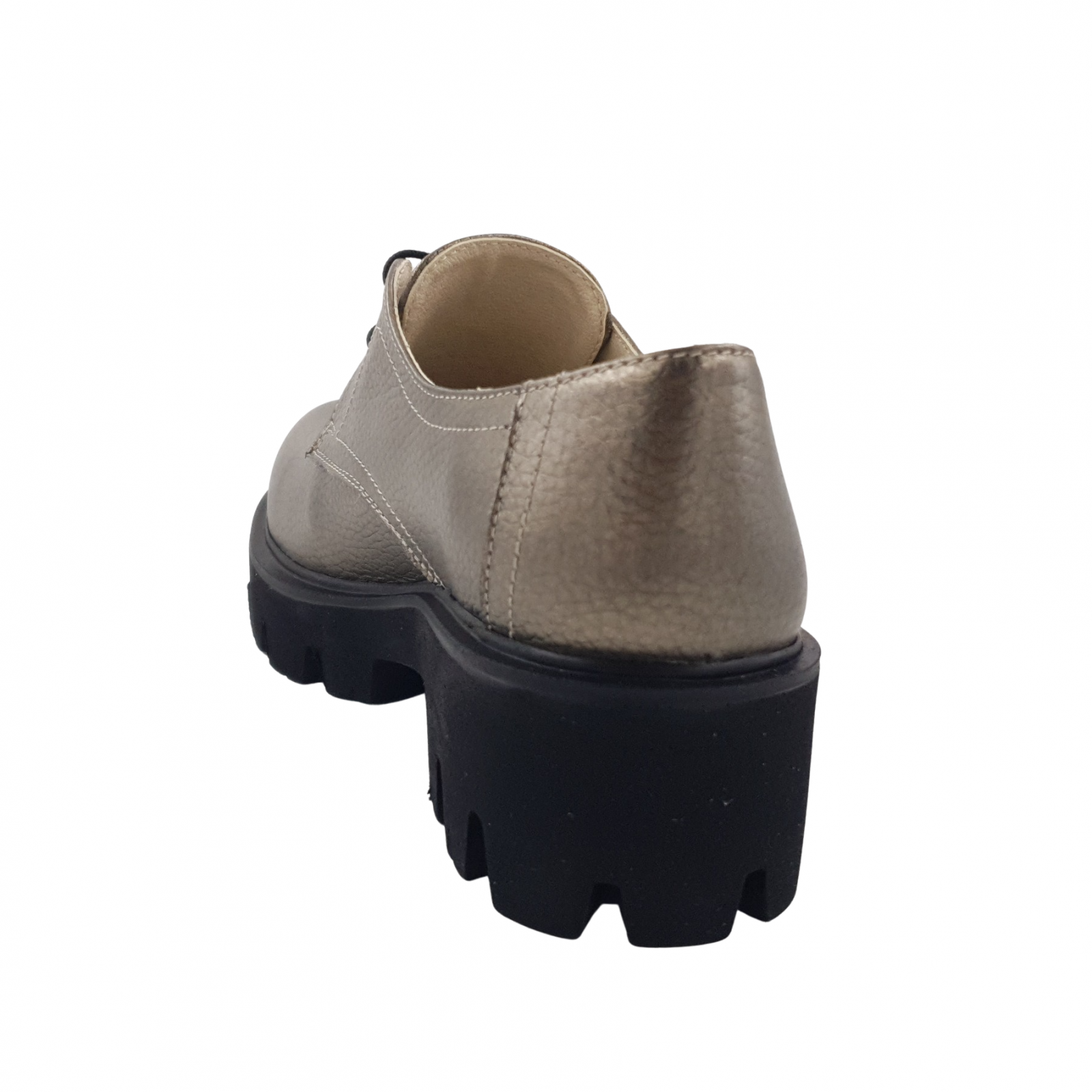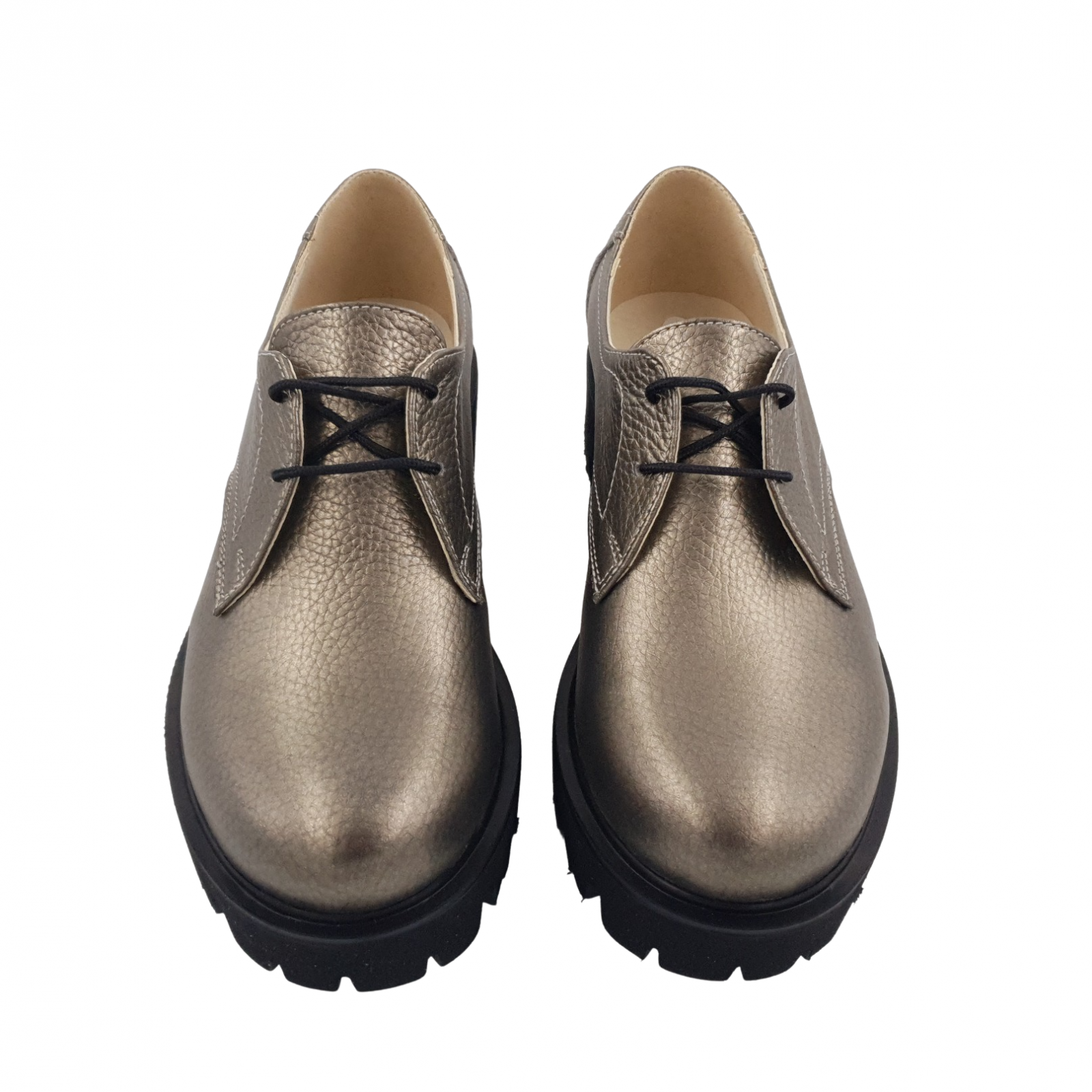 Pantofi damă din piele naturală bizonată de culoare bronz, în interior are piele ecologică bej, se închide cu șireturi negre, talpă ușoară din poliuretan de culoare neagră, de purtat pentru sezonul de primavară, vară și toamnă.