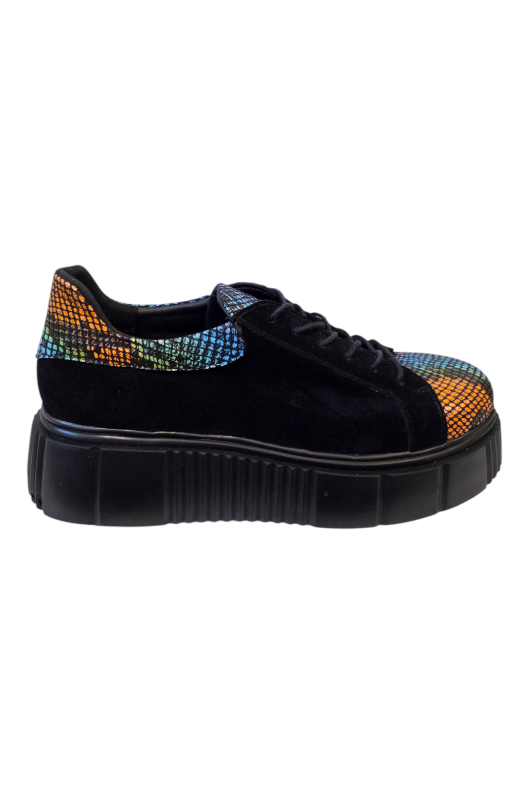 Alege un stil care iese din tipare cu acești pantofi casual pentru femei, confecționați din piele naturală întoarsă neagră, completată de un imprimeu spectaculos tip piele de șarpe în nuanțe iridescente de albastru, portocaliu, verde și galben. Bombeul se continuă armonios cu limba, iar staiful adaugă un accent vizual îndrăzneț, transformând acest model într-o piesă statement.