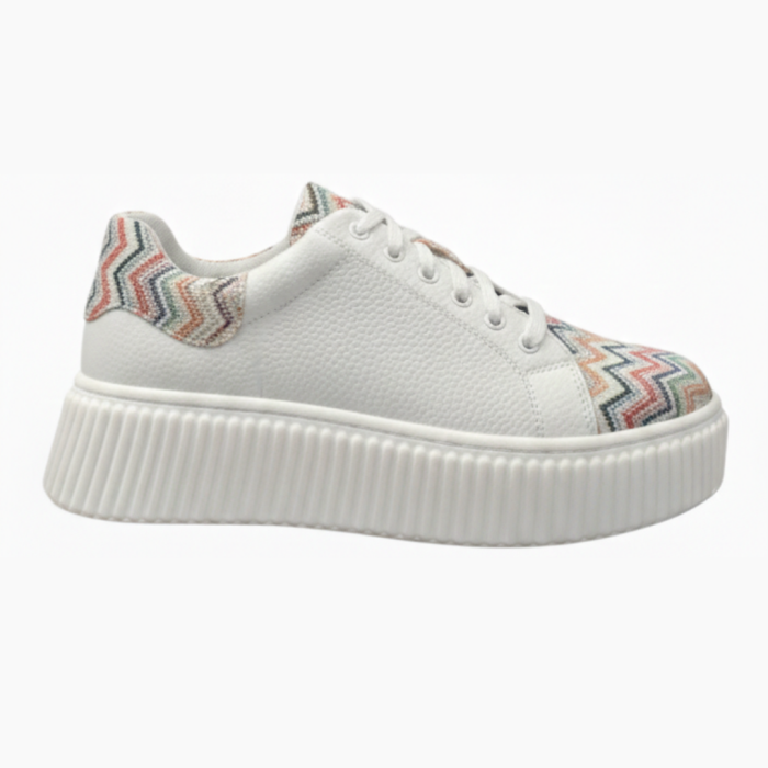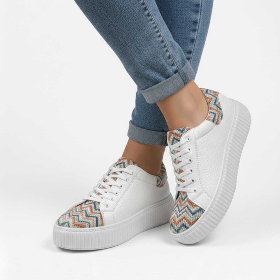 Acești sneakers pentru damă sunt realizați din piele naturală texturată (bizon) de culoare albă și sunt accentuați de un imprimeu geometric multicolor în zig‑zag, care adaugă un plus de energie și personalitate. Talpa cusută oferă durabilitate și stabilitate, iar interiorul din piele naturală menține piciorul confortabil și aerisit pe tot parcursul zilei. Închiderea cu șireturi permite ajustarea perfectă, oferind un fit sigur și comod.