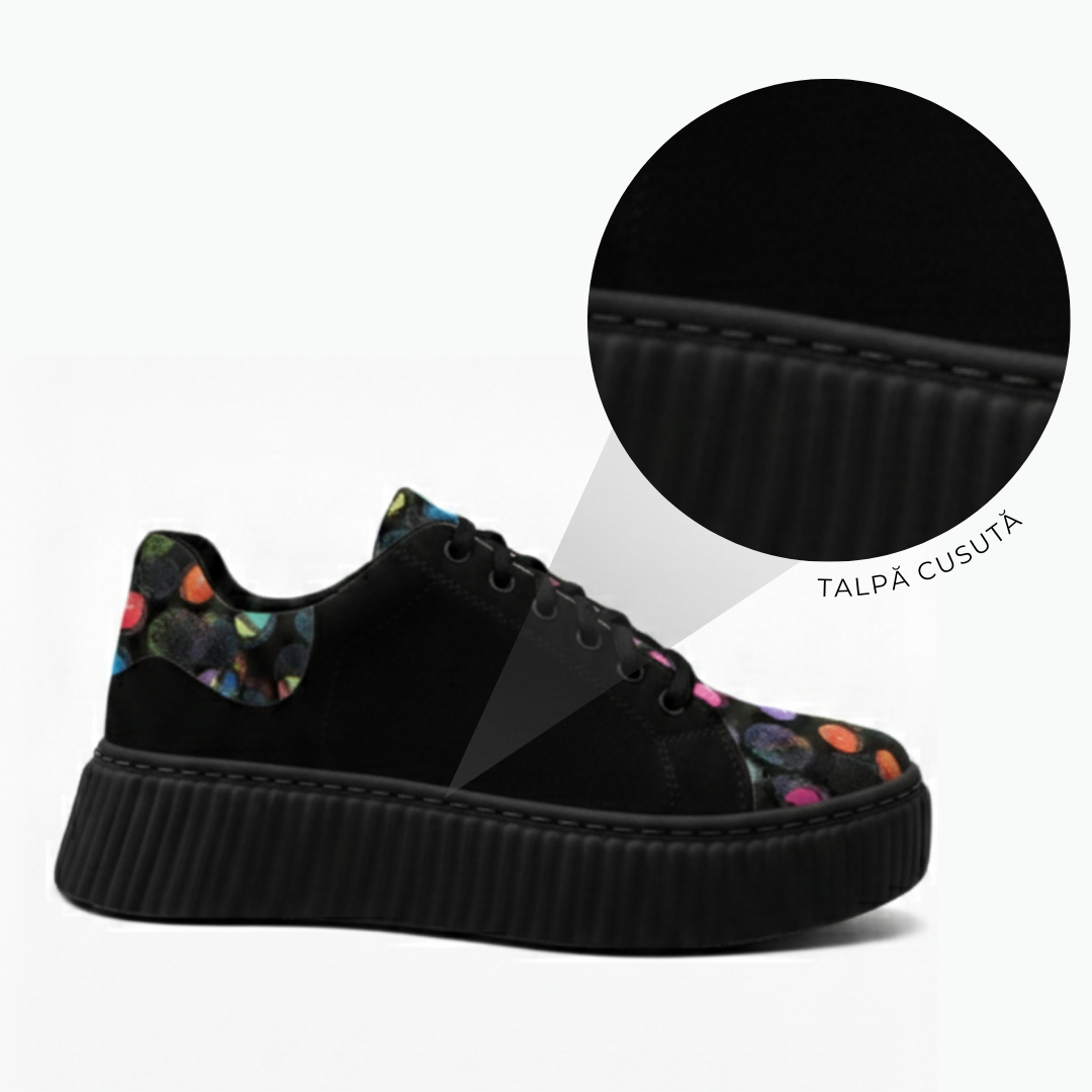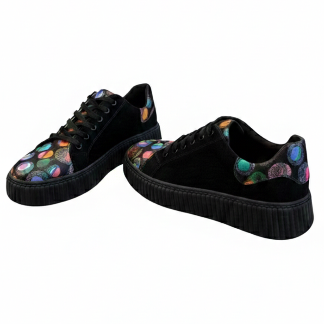 Acești sneakers pentru damă combină pielea întoarsă neagră cu un imprimeu vibrant cu buline colorate, transformându-i într-o piesă statement care atrage instant privirea. Textura fină a pielii întoarse oferă un aspect elegant și modern, iar detaliile multicolore de pe vârf, limbă și călcâi adaugă un plus de personalitate și energie.